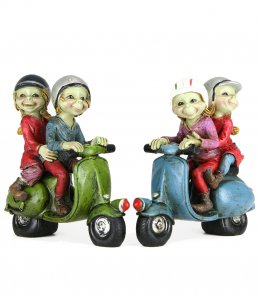 Coppia di Pixie seduti sulla Vespa, in versione blu o verde; prodotto dalla Les Alpes, è realizzato in resina e finemente dipinto a mano, misura circa 11,5 cm.