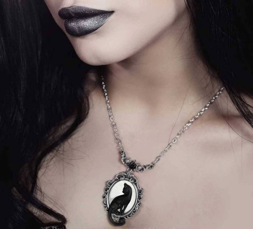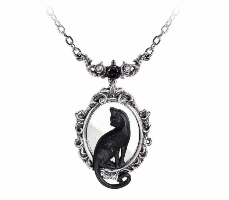 Bellissimo ciondolo con specchio ovale in peltro in stile barocco e gatto in peltro nero seduto a guardare lo specchio.