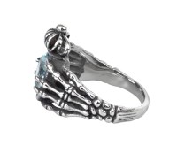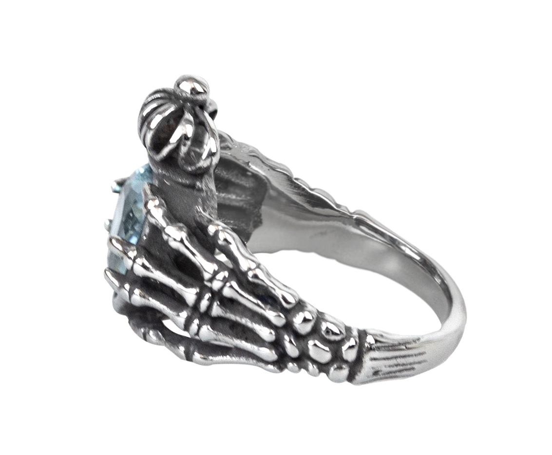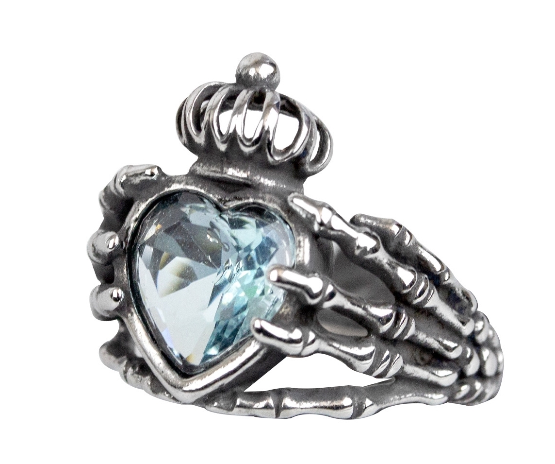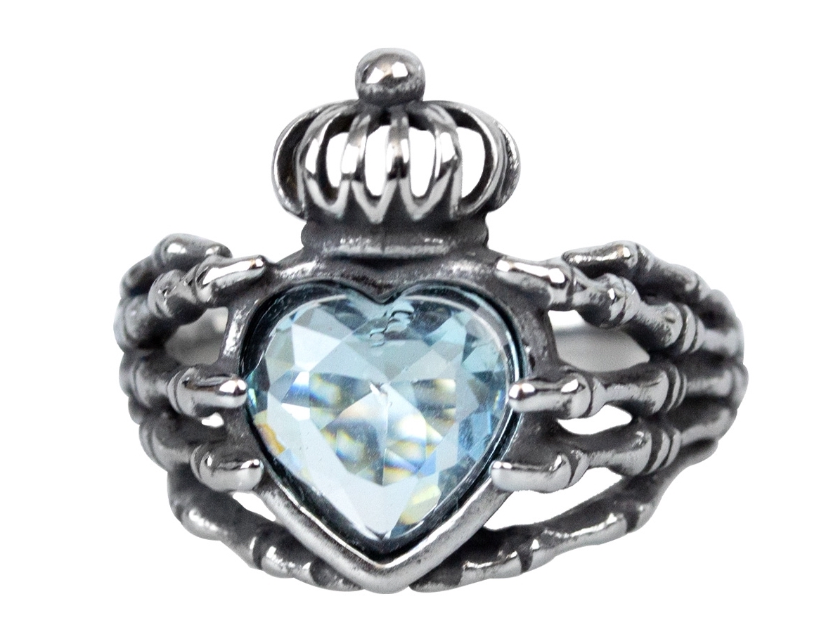 Anello Claddagh in un'originale interpretazione gotica con mani scheletriche e pietra blu ghiaccio.