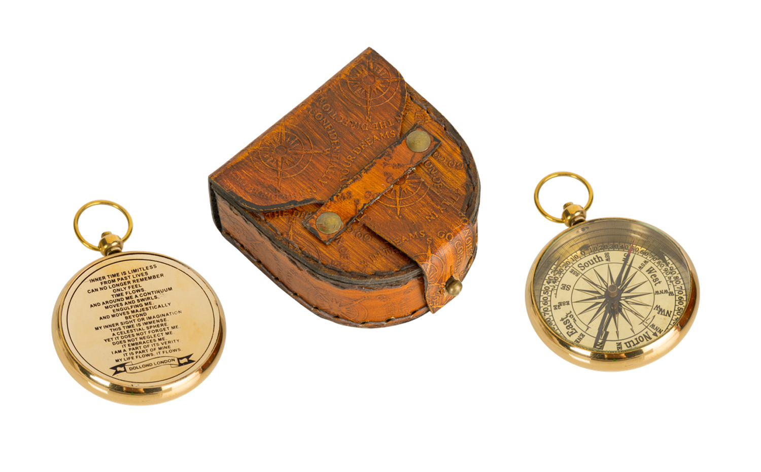 La parola 'bussola' designava in origine la scatola di bosso. La bussola aprì il mondo dell'esplorazione e della scoperta. Nel III o secolo A.C., i cinesi usavano già il concetto di ago magnetico. Fu usato questo concetto dai preti feng shui, nello scopo di indicare i luoghi dove costruire e nel modo in cui si doveva fare. I marinai cinesi l'adattarono, attorno all'anno 1000 alla navigazione in mare per mantenere la rotta. La prima bussola era un recipiente pieno d'acqua sulla quale galleggiava un ago magnetico sospeso a un filo. Gli arabi lo perfezionarono montandolo su un'asse. Arriva in Europa tra il X o e l' XI o secolo permettendo ai marinai di attraversare Oceani e agli esploratori di scoprire continenti. Il primo strumento costruito con l'aspetto moderno che conosciamo noi è stato fatto da il Portoghese Ferrande (1483).Bussola in ottone decorata con una rosa dei venti e la sua fodera di velluto blu scuro.