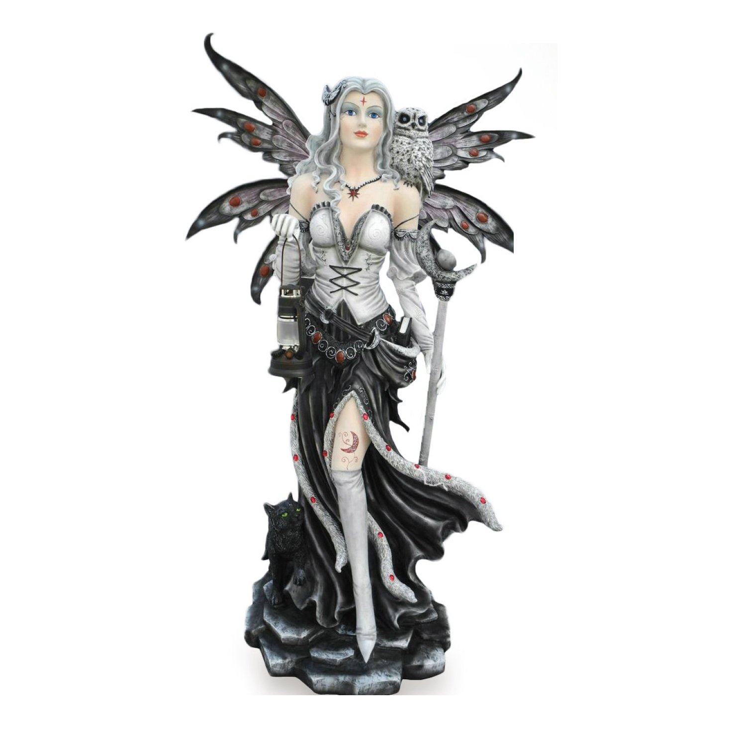 Stupenda, maestosa e gigantesca statua rappresentante una splendida fata notturna in toni scuri, con un simpatico gufo da compagnia.