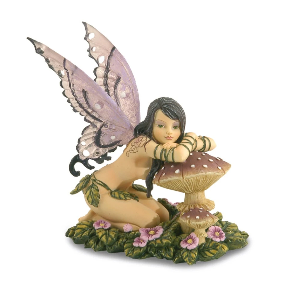 Bellissima fata realizzata in resina e dipinta a mano, della collezione Fairy Land di Les Alpes. Misura circa 12.5 cm. La Fata si trova appoggiata a un fungo.