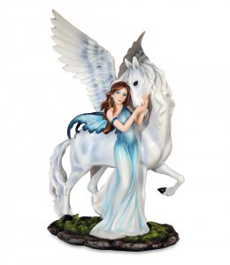 Bellissima fatina con Pegaso, della collezione Fairy Land, prodotta dalla Les ALpes, realizzata in resina e dipinta a mano.