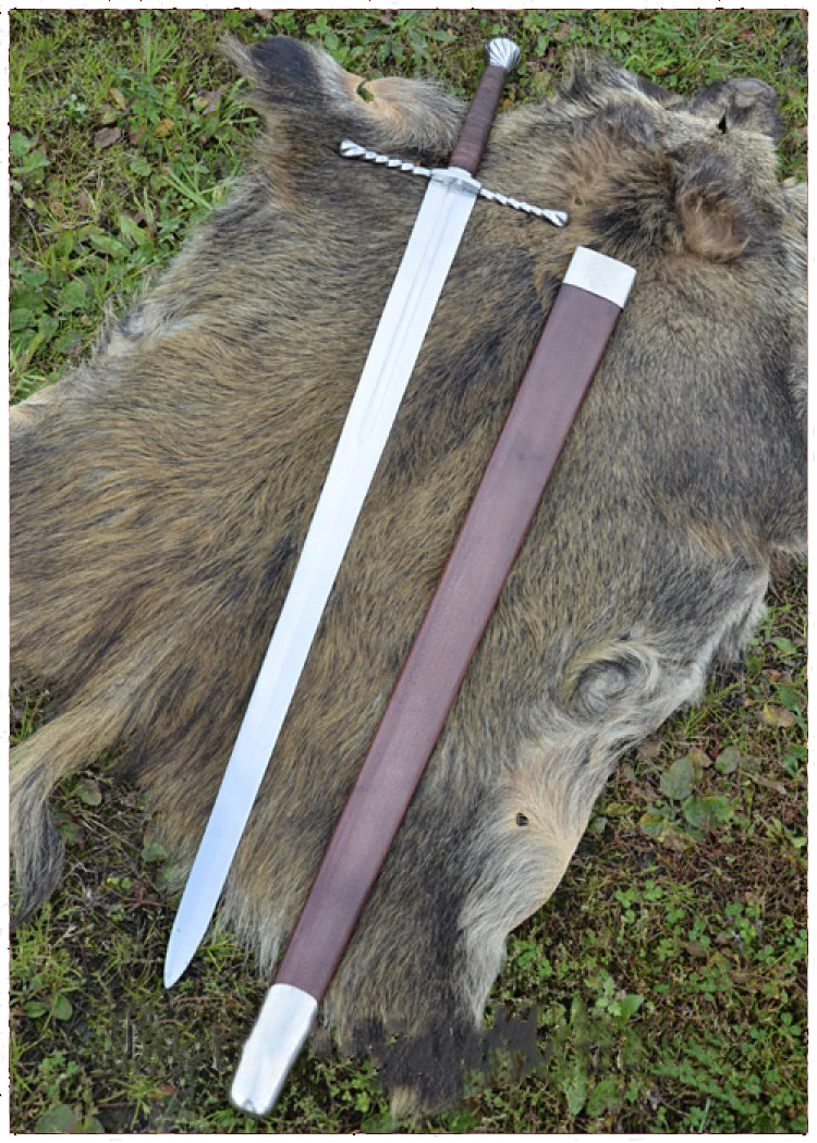 Spada a una mano e mezza utilizzata nel Medioevo e Rinascimento, realizzata con acciaio ad alta percentuale di carbonio. Il fodero è in legno coperto con pelle e con finiture in metallo. La guardia e il Pomolo sono in acciaio. Misura complessivamente 118,5 cm mentre la lama misura circa 92.5 cm.