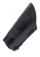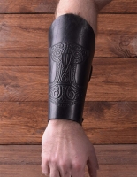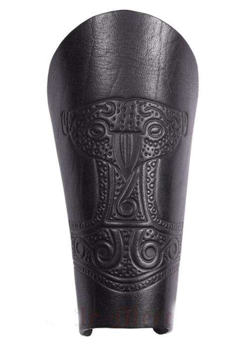 Parabraccia da guerriero regolabili, realizzate in cuoio nero, con un incisione del Martello di Thor.
