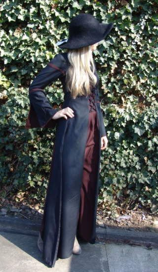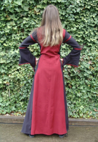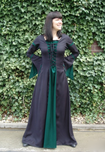 Elegante abito medievale con maniche svasate e allacciature a lacci incrociati sul petto. Realizzato in 100% viscosa, disponibile in varie taglie nei colori nero/rosso, nero/verde, nero/marrone.