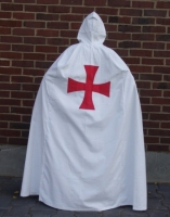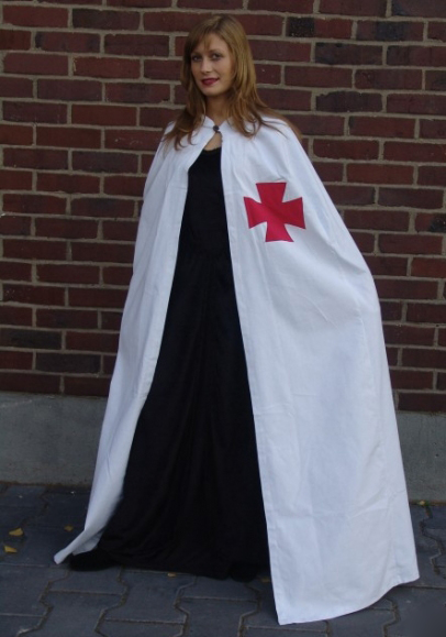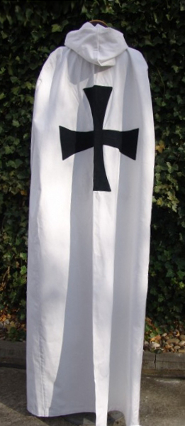 Mantello medievale in 100% cotone con simboli templari e cappuccio.